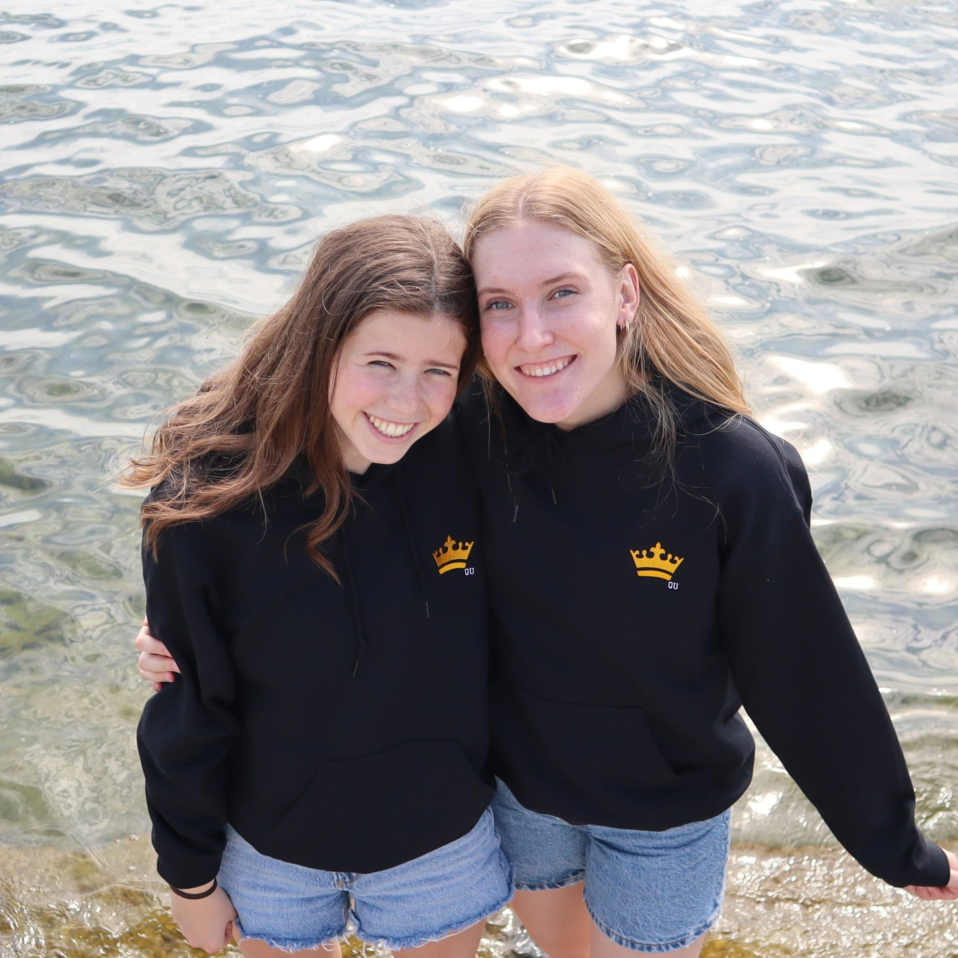 Black hoodie, with a small embroidered gold crown and white 'QU'